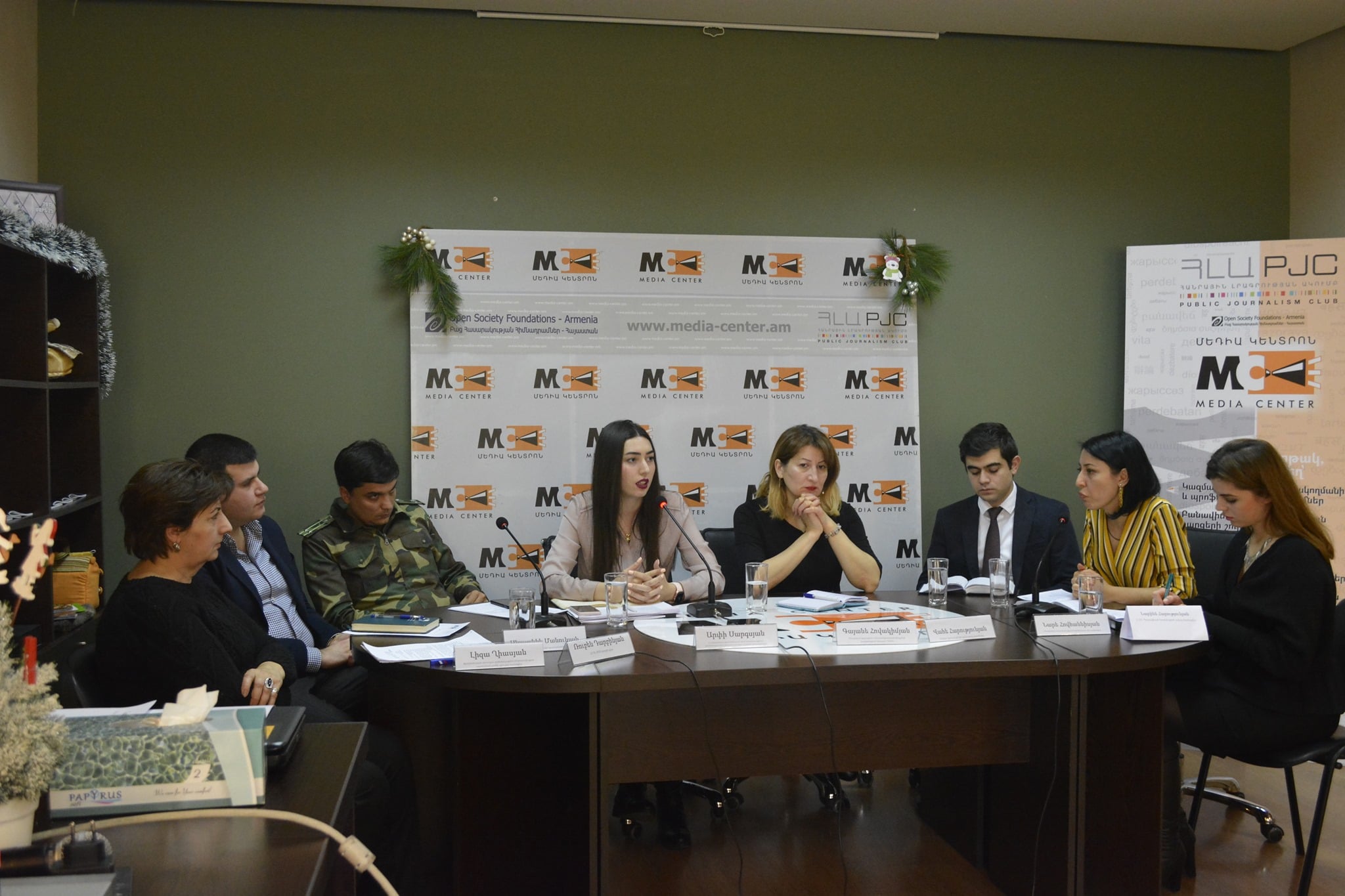 Քննարկման բանախոսներն էին` ՀՀ արդարադատության նախարարության հակակոռուպցիոն և քրեակատարողական քաղաքականության մշակման վարչության պետ` Արփի Սարգսյանը, «Իրավական կրթության և վերականգնողական ծրագրերի իրականացման կենտրոն» ՊՈԱԿ-ի տնօրենի տեղակալ` Գայանե Հովակիմյանը, «Իրավական նախաձեռնությունների կենտրոն» հկ-ի նախագահ`Նարե Հովհաննիսյանը, Հայաստանում ԱՄՆ դեսպանատան դրամաշնորհների մասնագետ`Անդրանիկ Մանուկյանը, Զբաղվածության պետական գործակալության, ՀՀ ԱՆ քրեակատարողական ծառայության, պրոբացիայի ծառայությության, Մարդու իրավունքների պաշտպանի աշխատակազմի ներկայացուցիչներ: